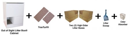 Out of Sight Litter Box cabinet package included cabinet, TraxTurf pads, Two High-Sider Litter Boxes, Litter Scoop and Odor Absorber.